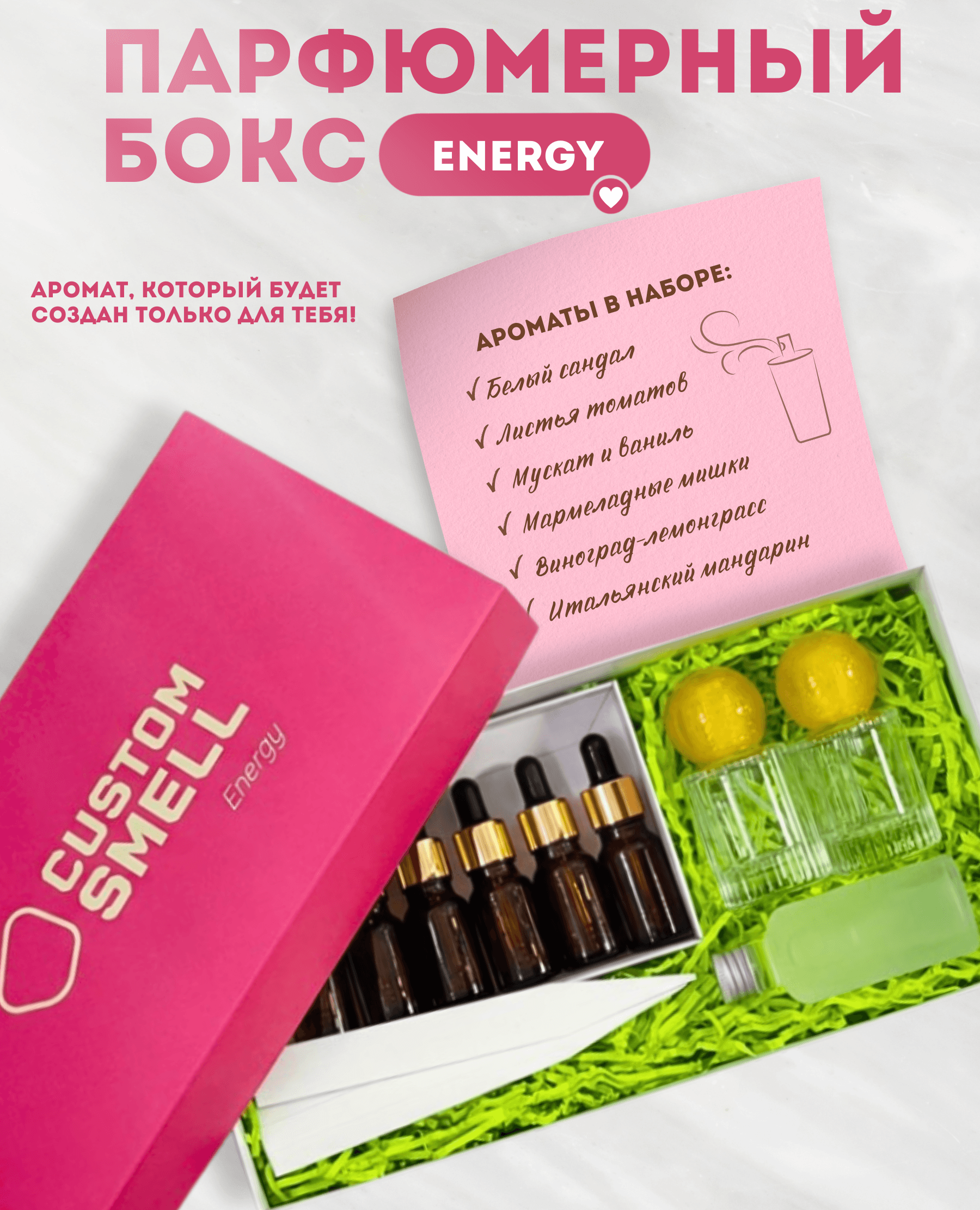В набор входит: • 6 ароматов • 1 база для создания духов • 2 флакона под духи • Блоттеры